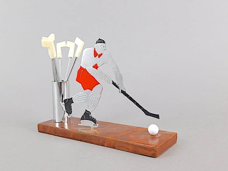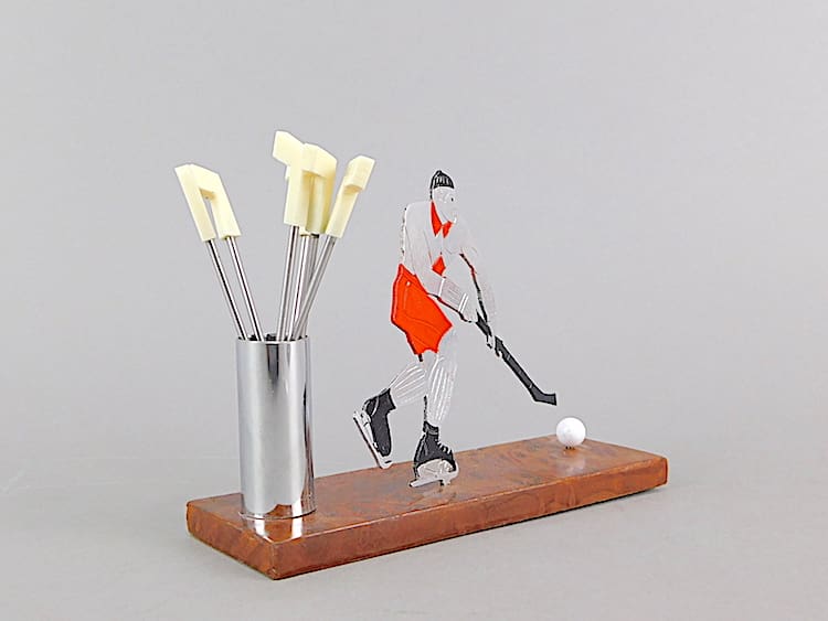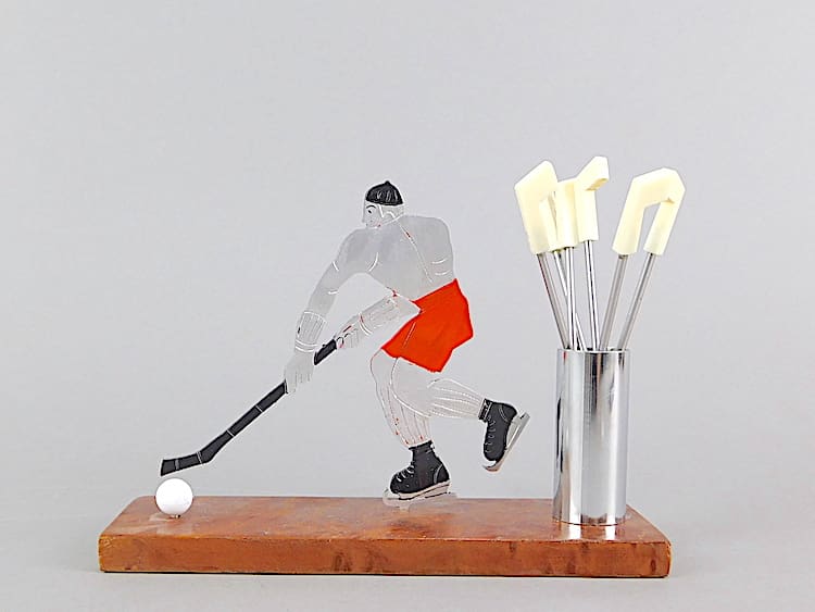 French art deco cocktail sticks set. Modelled as an Ice hockey player, and unsigned Sudre. Mounted on an amboyne wooden base.