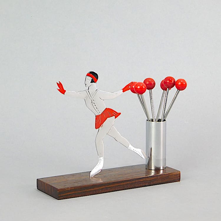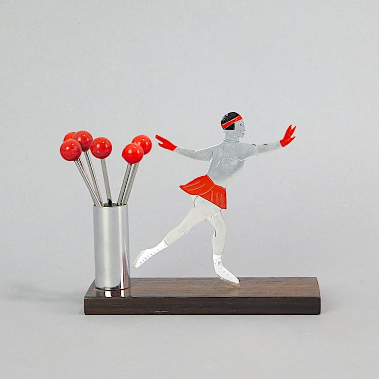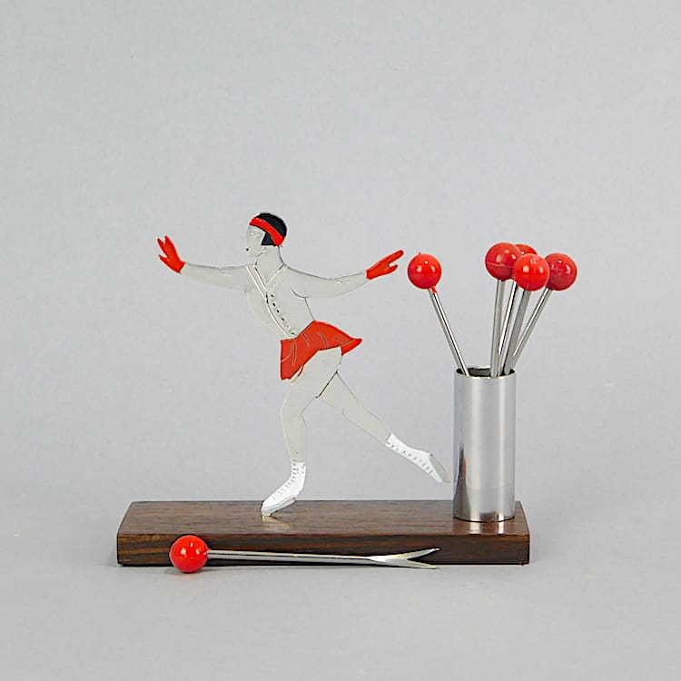French art deco unsigned Sudre 2-dimensional female ice skater, mounted on a macassar ebony wooden base.