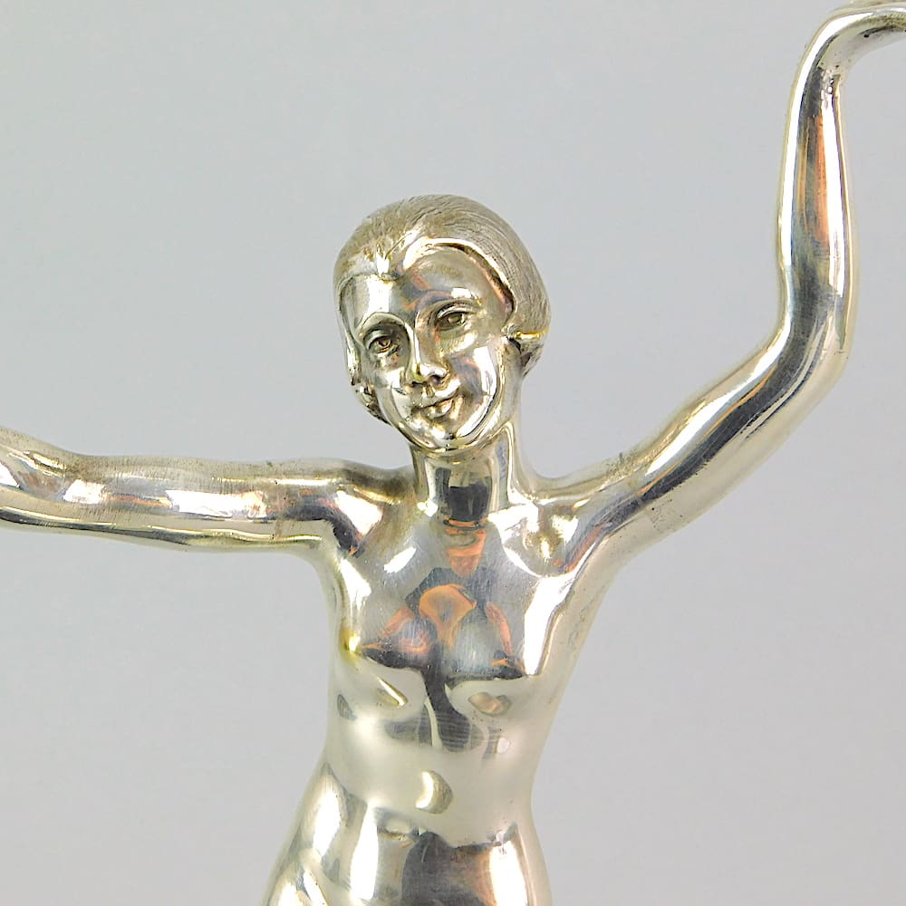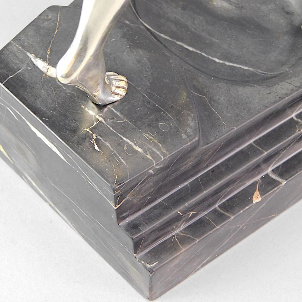 Silvered bronze art deco nude dancing on a shaped, stepped vide poche marble dish base. Signed to the base I. Gallo. Made by the Etling foundry.