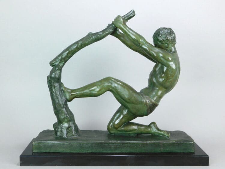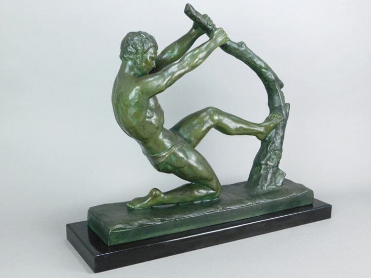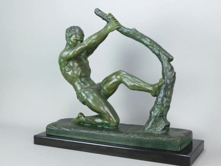 French spelter man levering a tree, a signed statue by Joe De Roncourt. He has a dark green-bronze patina and the base is made of spelter and black marble.
