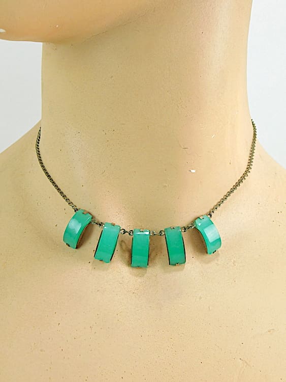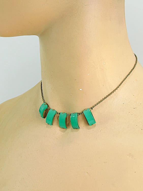 Delicate necklace with curved glass sections of jade glass that measures 0.75 inches (2cm) high, choker length necklace..