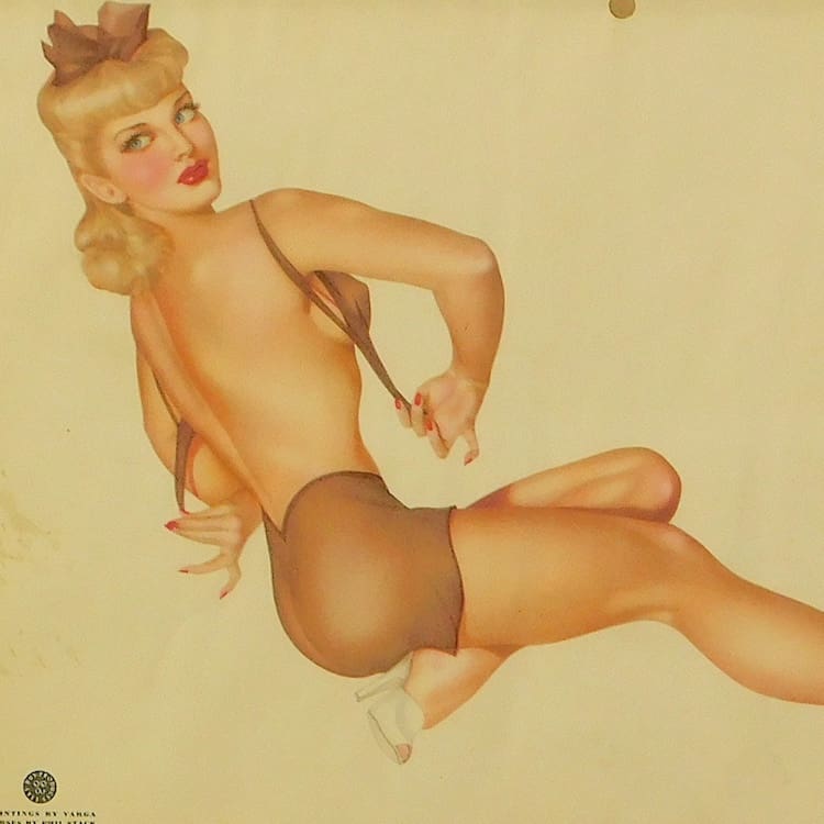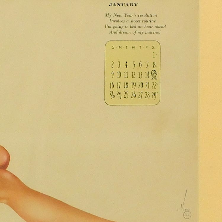 An original calender page from an actual Varga calender, from the year 1944. Esquire did not print the actual year of the calender before 1946. This one was made in 1944. The verse is by Phil Stack. The picture is showing the calendar framed but will not be sold framed.