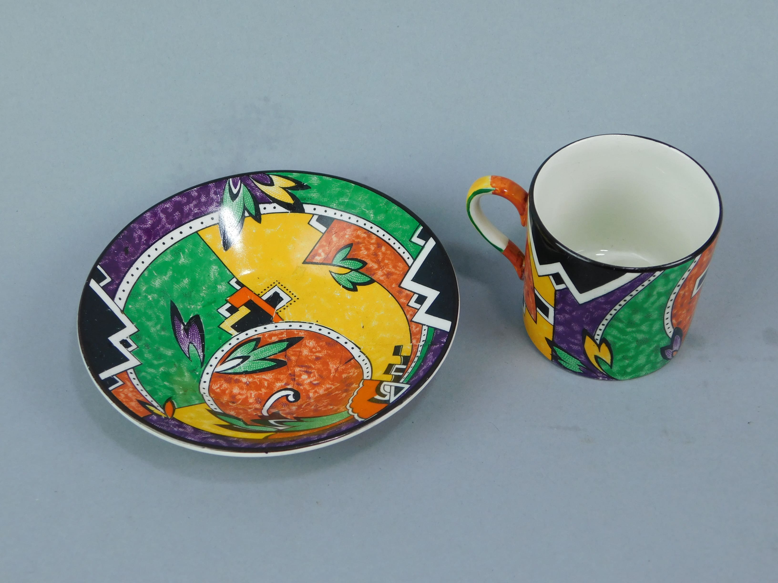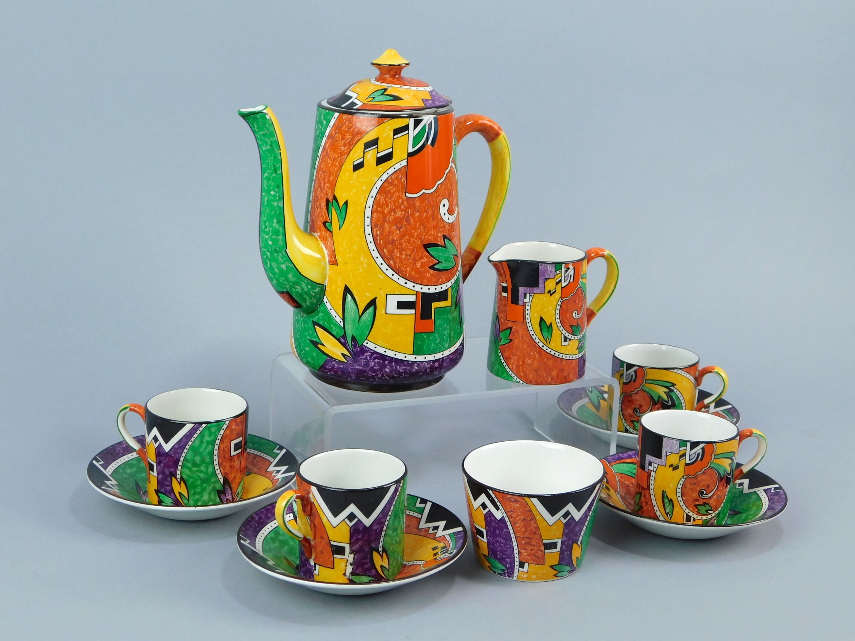 This wonderful English coffee set is known as Jazztech and was made by Royal Winton. It consists of coffee pot, milk jug, sugar bowl and 4 coffee cannisters with saucers.
