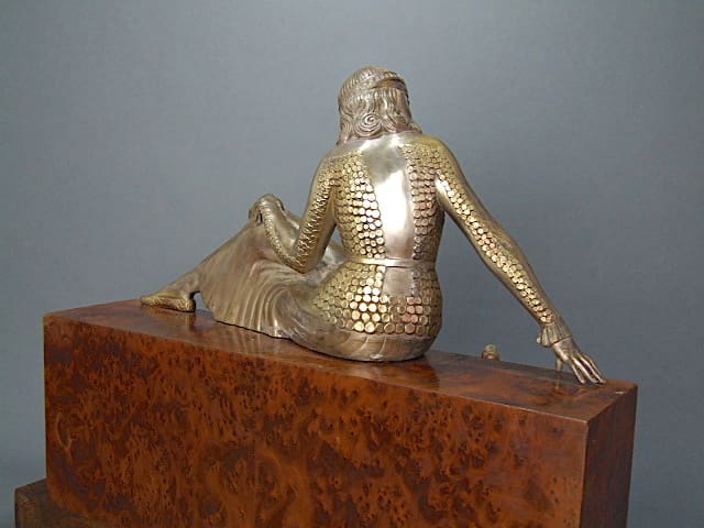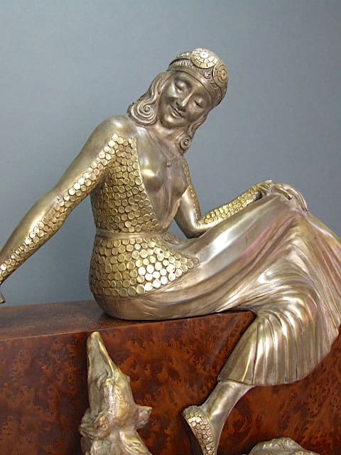 Large French gilt bronze art deco lady and dog group mounted on an amboyne wood base. Signed Lemo which is a pseudonym for Jean Lemoine.
