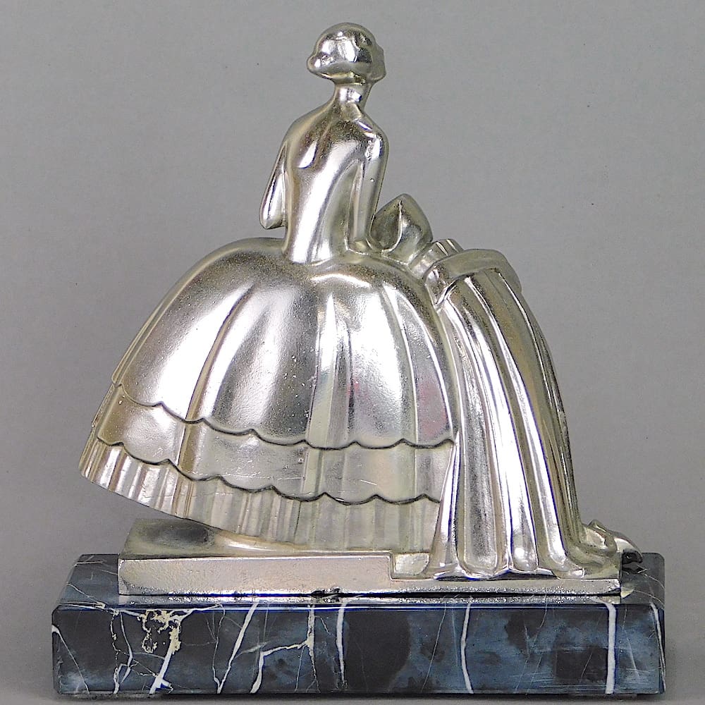 Stylised silvered bronze Pierotte and Columbine statue of a man courting a lady.
