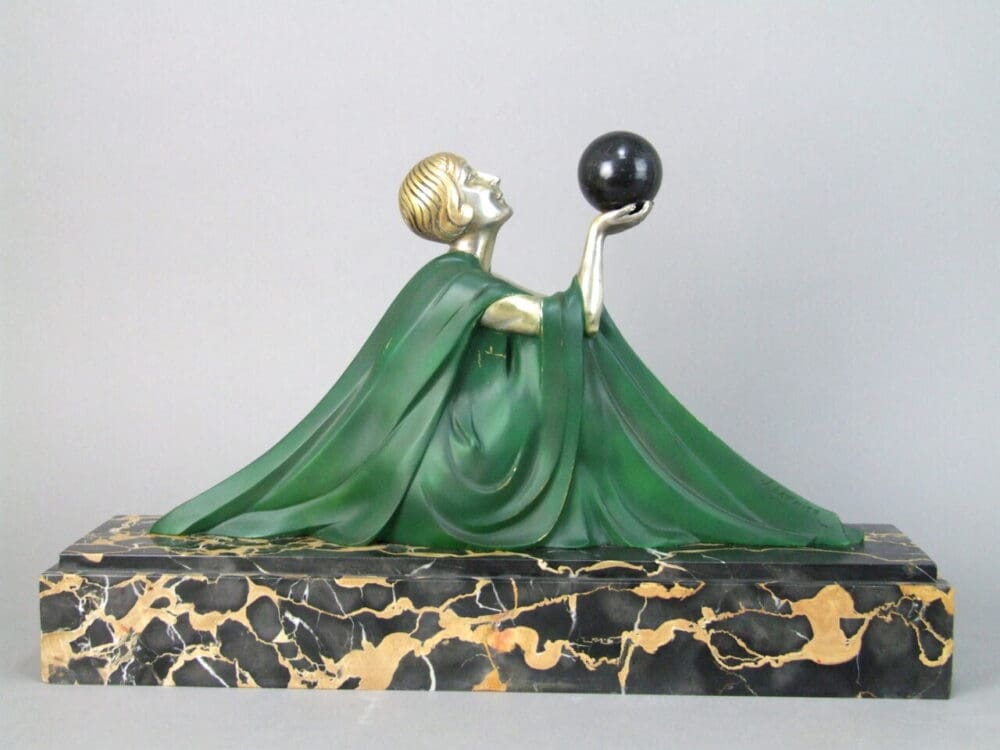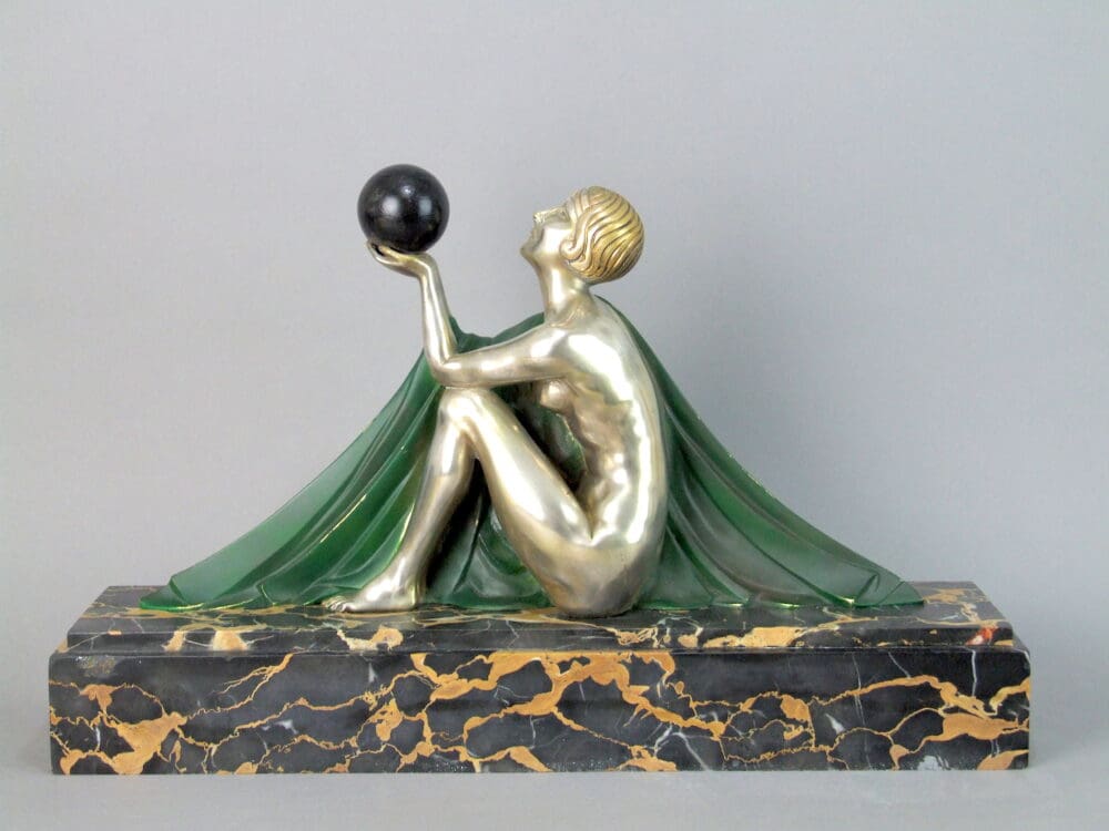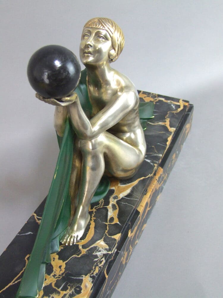 French art deco silvered and patinated bronze statue – Reverie by Lormier. Mounted on a portorro marble base and signed to the bronze.