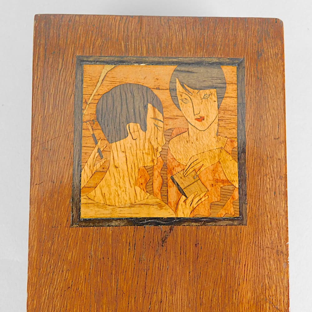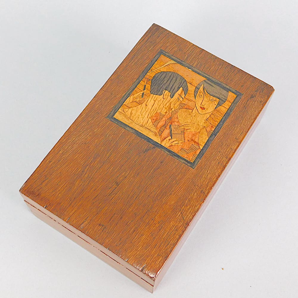 Fabulous French wooden box probably originally a cigarette box but ideal as a jewellery box. The cover has a marquetry inlay panel showing two deco ladies, one holding a cigarette case and the other a holder.