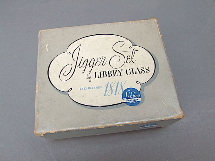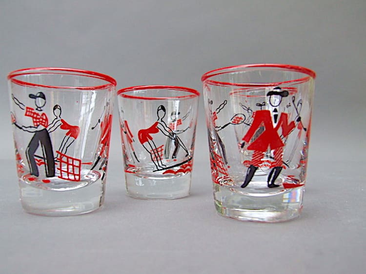 A set of 4 sports themed Jigger glasses by Libbey Glass. Made in the USA and each glass depicts a water skier, tennis player and jockey.