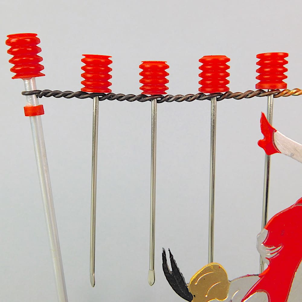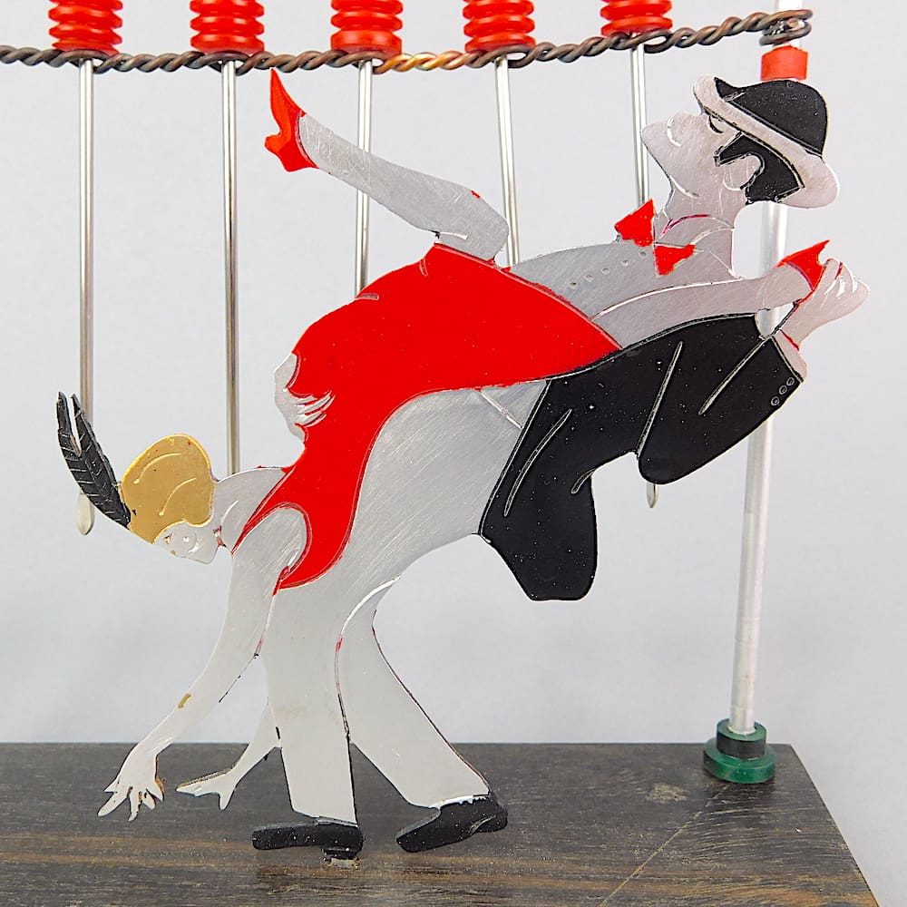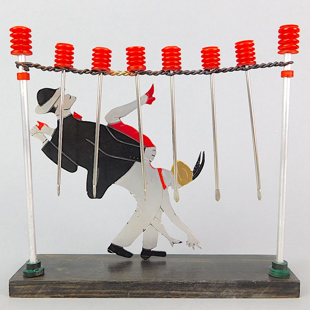 Rare French art deco 2 dimensional hand painted cocktail sticks set of a couple jiving on a wooden base.
