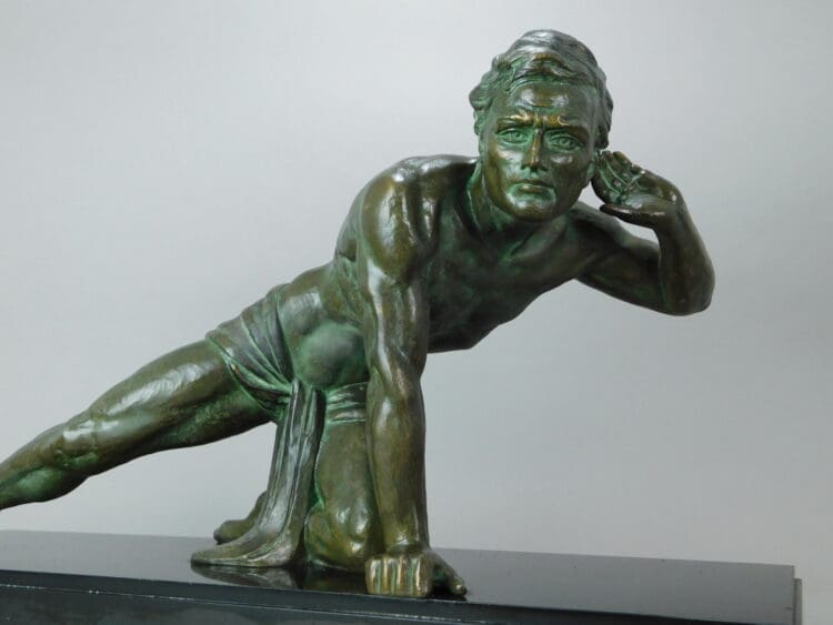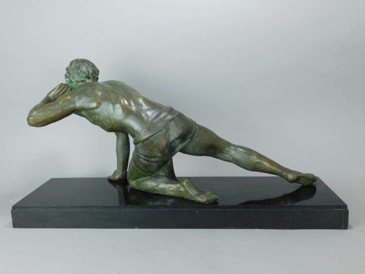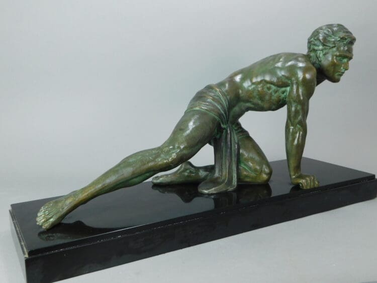 A handsome French spelter figure – this one signed by J.De Roncourt to the base. He has a green bronzed patina and is mounted on a Belgian Black Marble base.