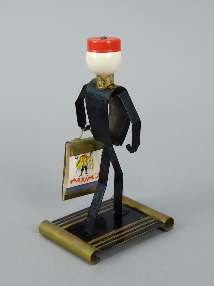 American Phillip Morris cigarettes advertising figure – known as Johnny Bellhop. Made in 2 sizes this is the smaller. He is holding a case which is a matchbook holder and comes with an original (unused) metal ashtray.