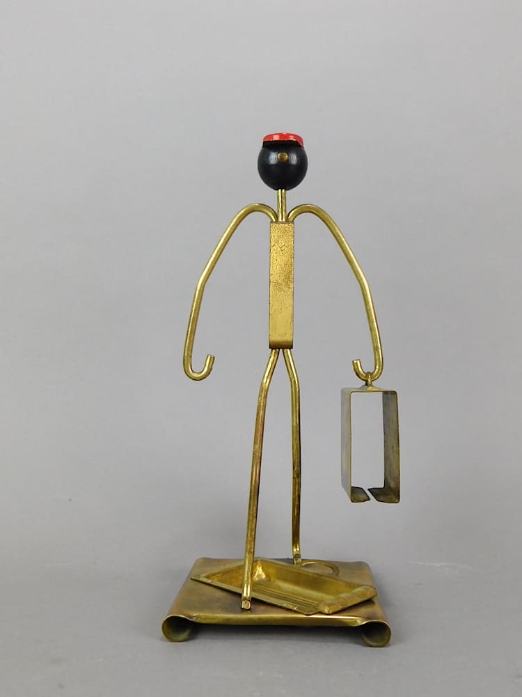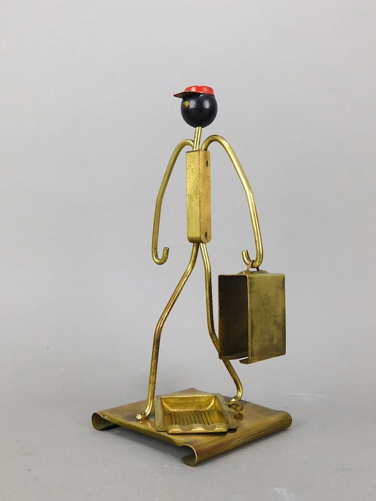 American Johny Bellhop figural smokers set. Made by Chase for the Philip Morris cigarette company to advertise the cigarettes and previously displayed on shop counters. The man originally held two sets of luggage – one was a matchbook holder (now missing) and the other is a cigarette packet holder and to the base is a luggage suitcase ashtray. There were 2 sizes of Johny made and this is the larger one.