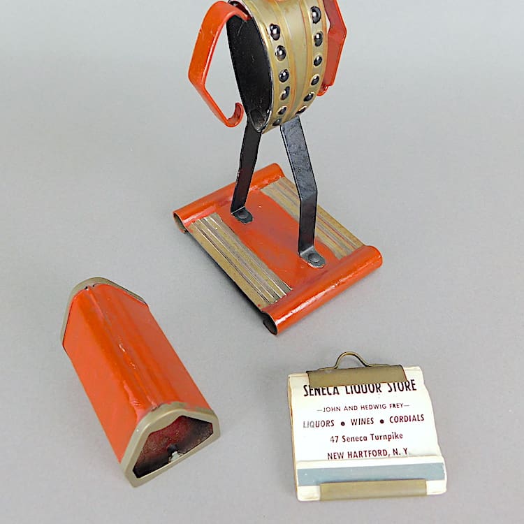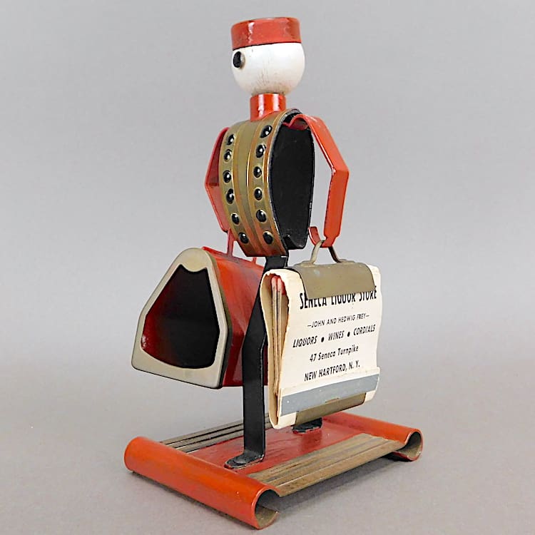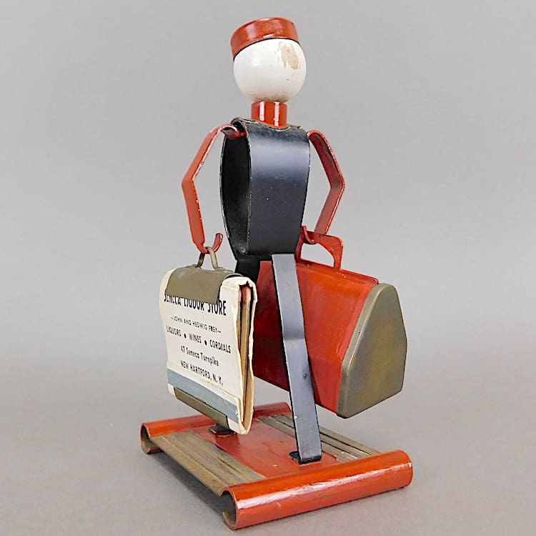 He was named after Johny Roventini who starred in the successful 1930’s ‘Call for Phillip Morris’ campaign. He was made with several uses, this one holds a suitcase with a book of matches and a case to hold cigarettes. Another was made holding a glass cruet set – one pot with salt and another with pepper – I have both of these in stock.