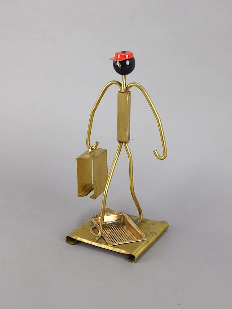 American bellhop advertising figure, made in the 1940s for the Philip Morris cigarette company. To the base is a suitcase ashtray and in one hand he carries a suitcase to slot cigarettes into.