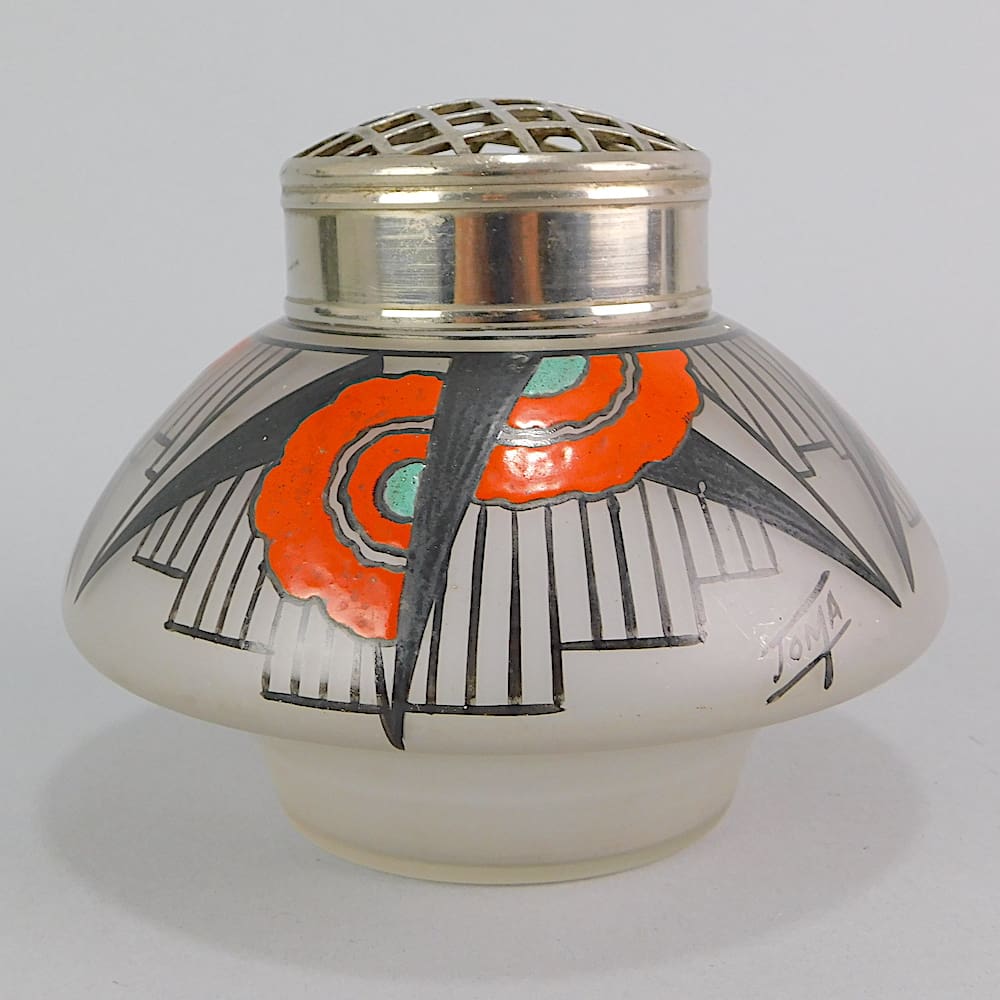 French vase by Joma, multi-coloured, high enamel, hand painted geometric design.