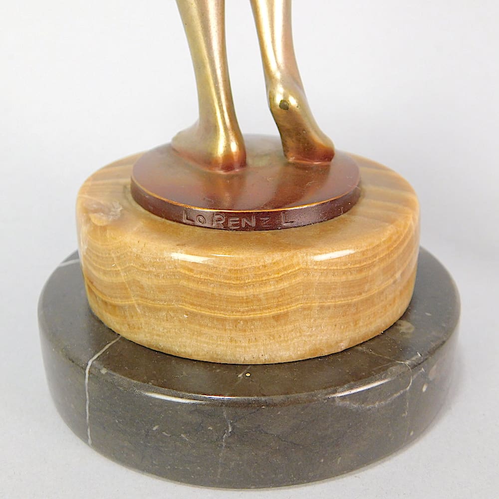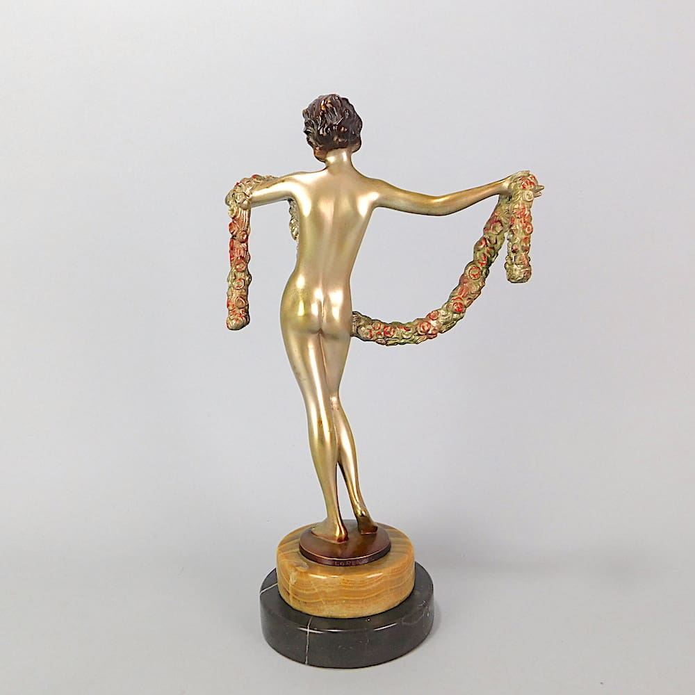 Austrian cold painted enamel bronze nude holding a garland of flowers, signed Lorenzl (Josef Lorenzl – 1892-1950) to the base metal. Mounted on a black marble and brown onyx base.