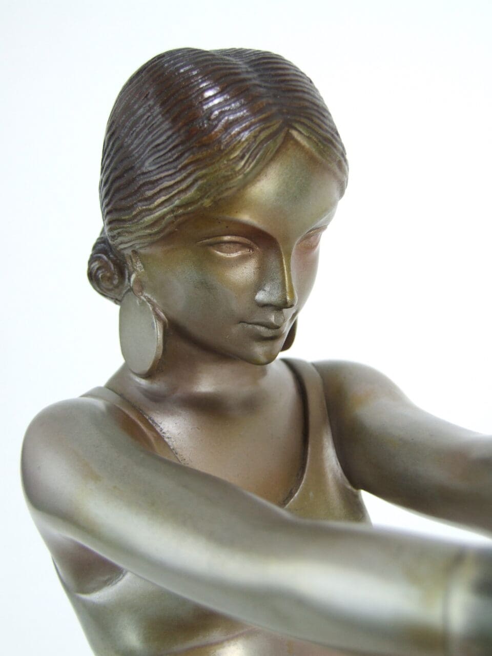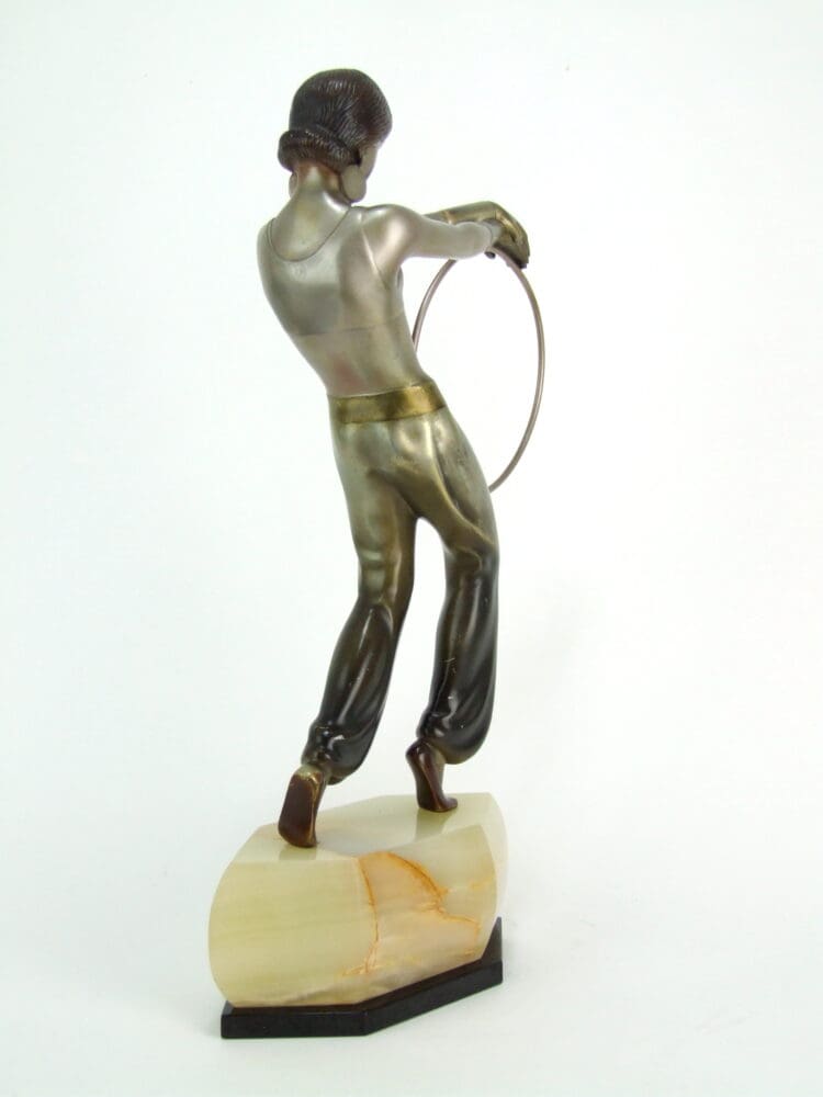 Large cold painted enamel bronze, mounted on an onyx lozenge shaped base with black marble lower panel. Signed LOR (Lorenzl) under her foot.