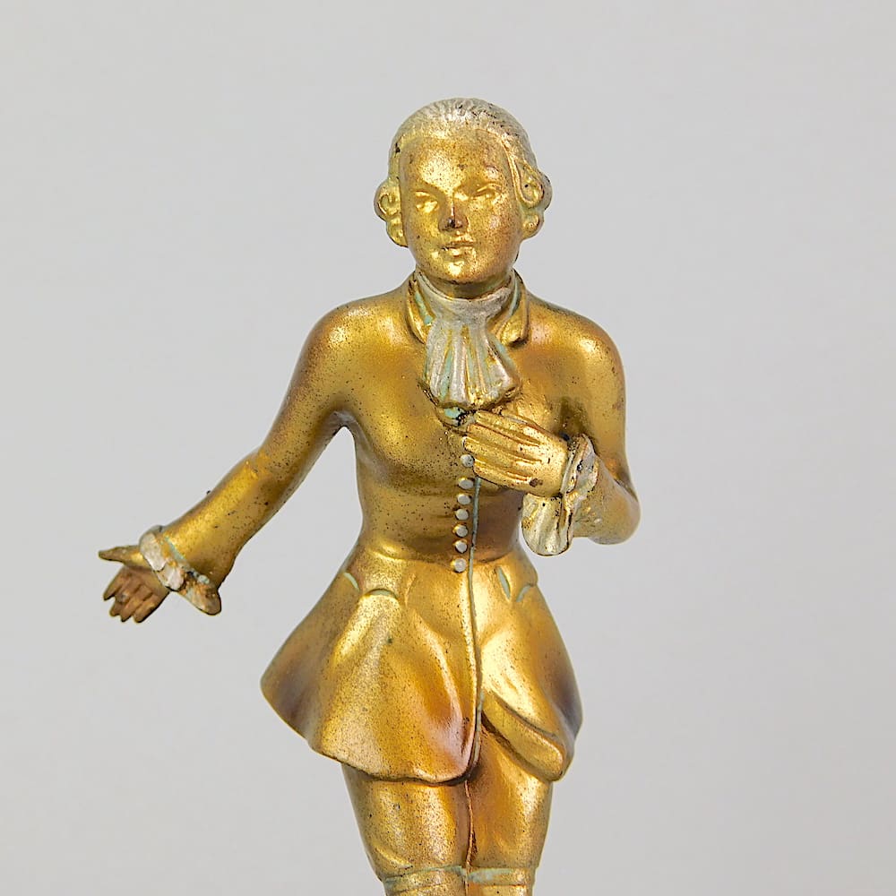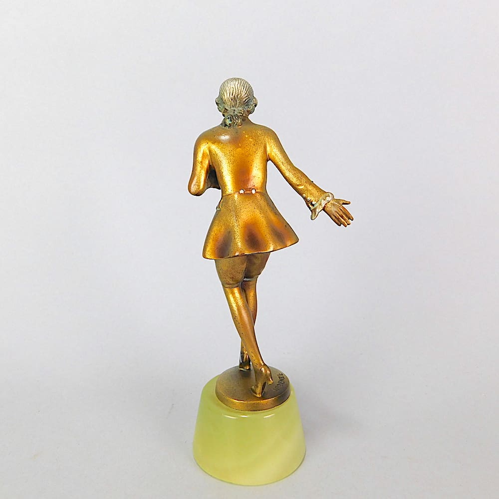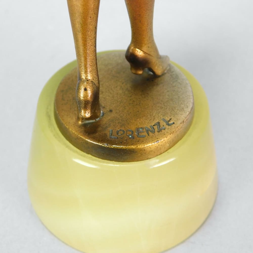Smaller bronze study signed Lorenzl to the bronze socle. Wearing a theatrical costume with a jacket and ruff collar and sleeves. Mounted on a Brazilian onyx tappered base.