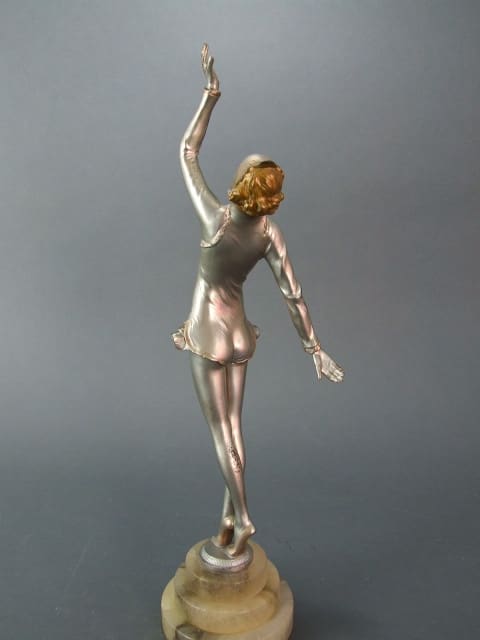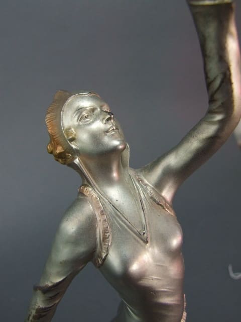 Large silvered spelter dancer, and unsigned Lorenzl. There is a sister to this piece (F1837) – they go really well together and the pose is slightly different plus the other one has a gilt finish. This one is mounted on an alabaster base.