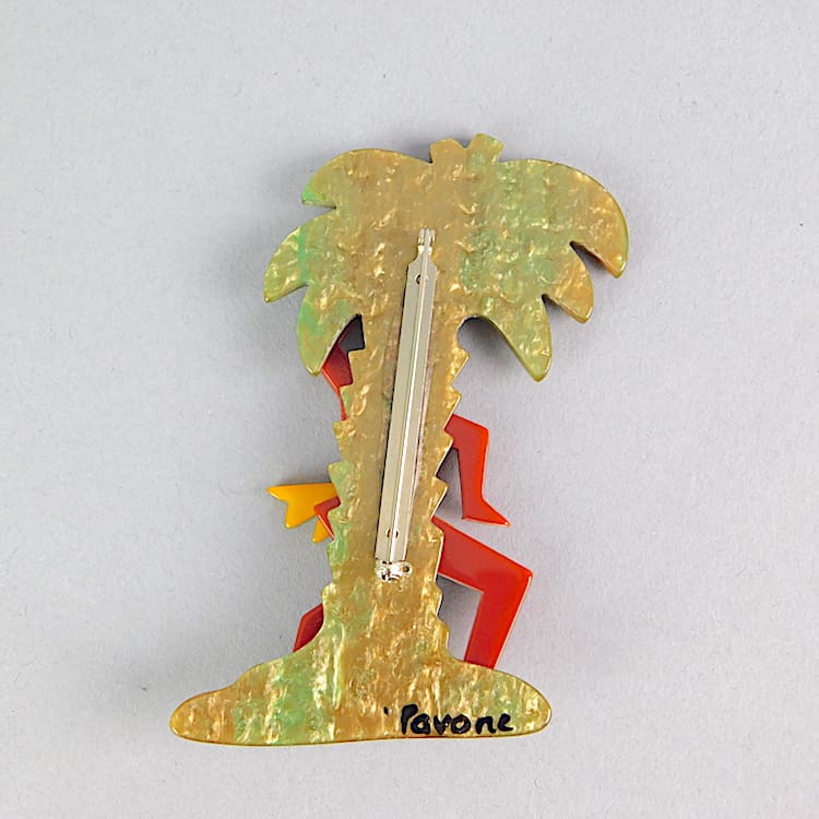 Hand painted phenolic brooch of Josephine Baker dancing her Banana Dance under a palm tree. Made by Marie-Christine Pavone and signed to the back. Fitted with a roll safety clasp.