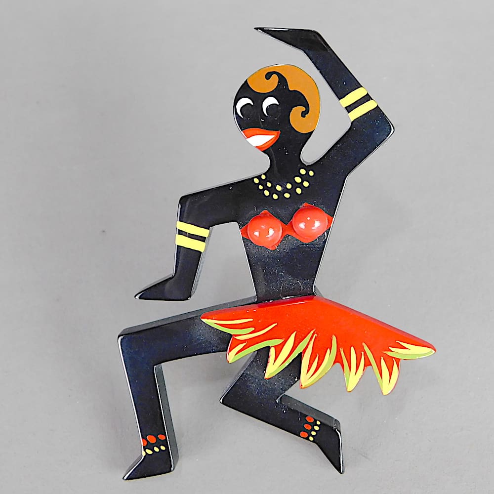 Beautifully hand painted vintage galalith Josephine Baker brooch by Pavone. Fitted with a roll safety clasp and signed by Pavone to the rear.