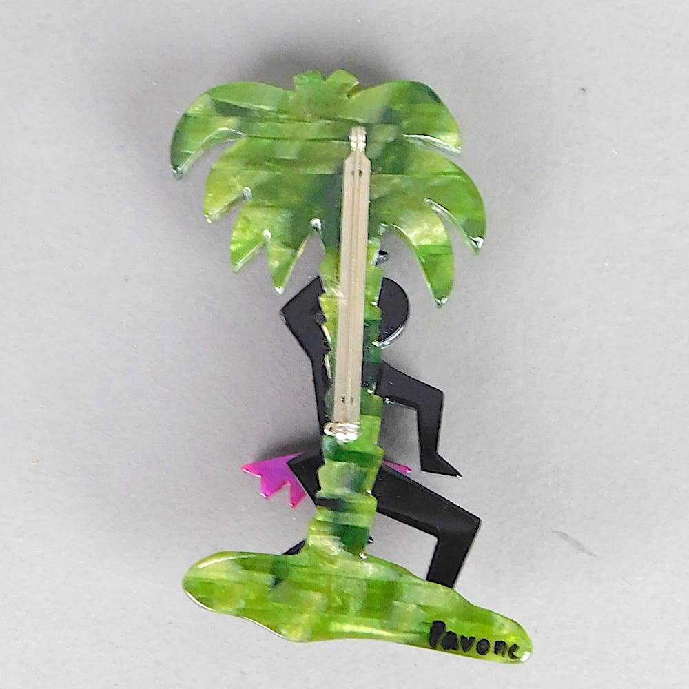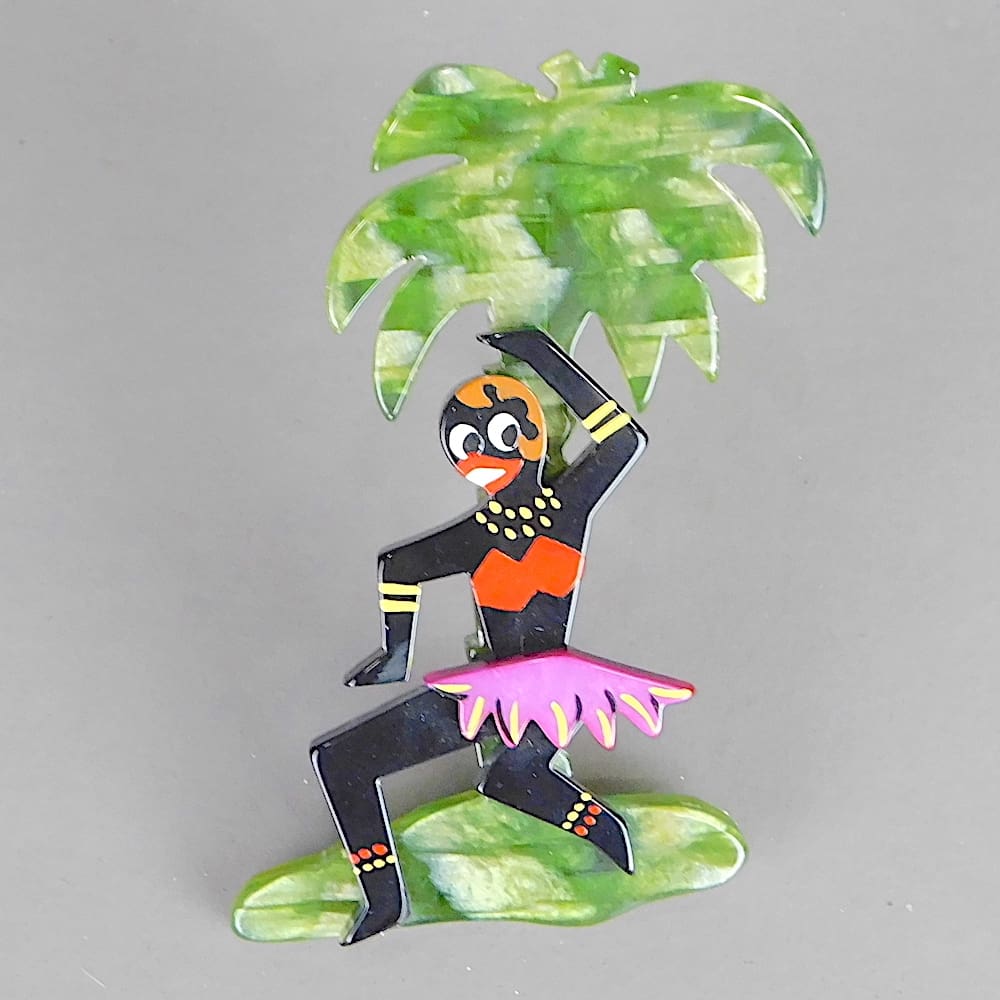 Hand painted phenolic brooch of Josephine Baker dancing here Banana Dance under a palm tree. Made by Marie-Christine Pavone and signed to the back. Fitted with a roll safety clasp.