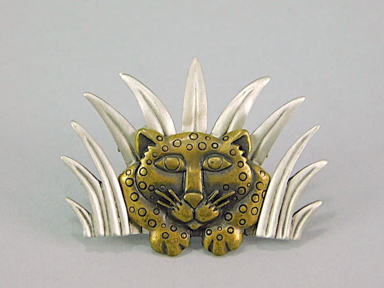 American rare art deco metal jungle brooch of a leopard in the grass. Made by the Jonette Jewellery company in the 1970s and stamped JJ to the reverse. Fitted with a roll safety clasp.