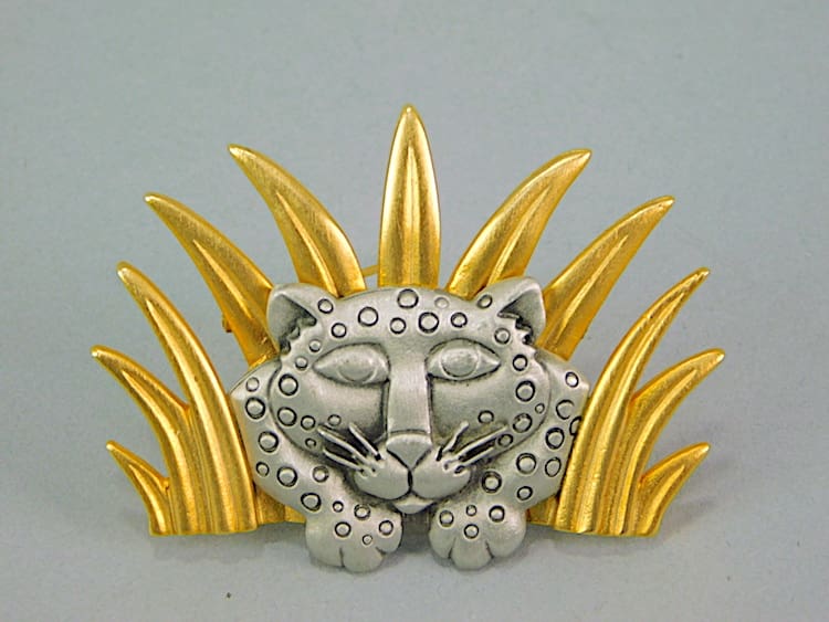 American rare art deco metal jungle brooch of a leopard in the grass. Made by the Jonette Jewellery company in the 1970s and stamped JJ to the reverse. Fitted with a roll safety clasp.