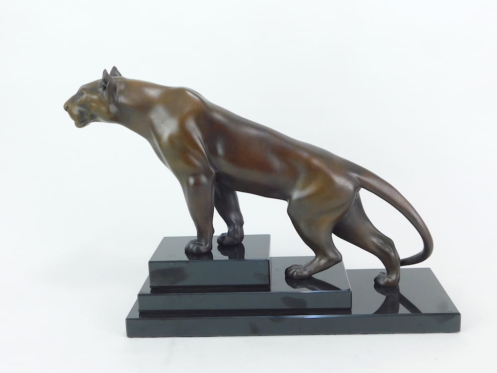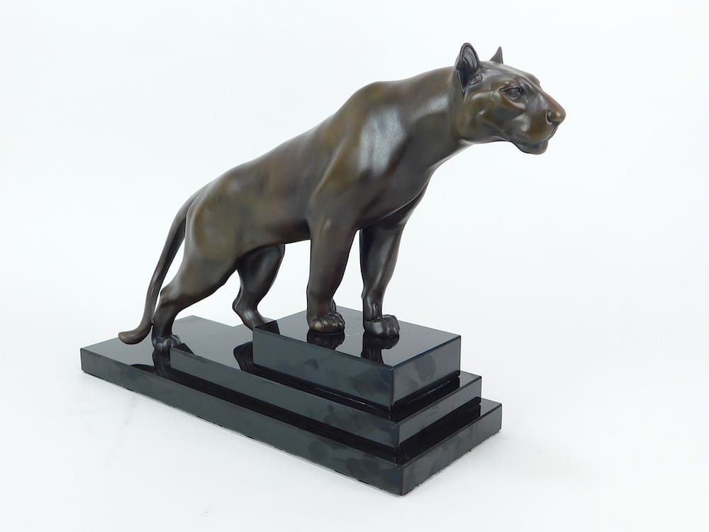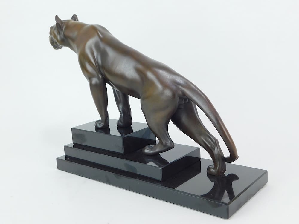 French art deco bronze patinated spelter panther statue mounted on a marble stepped base. Signed to the back leg.