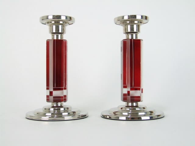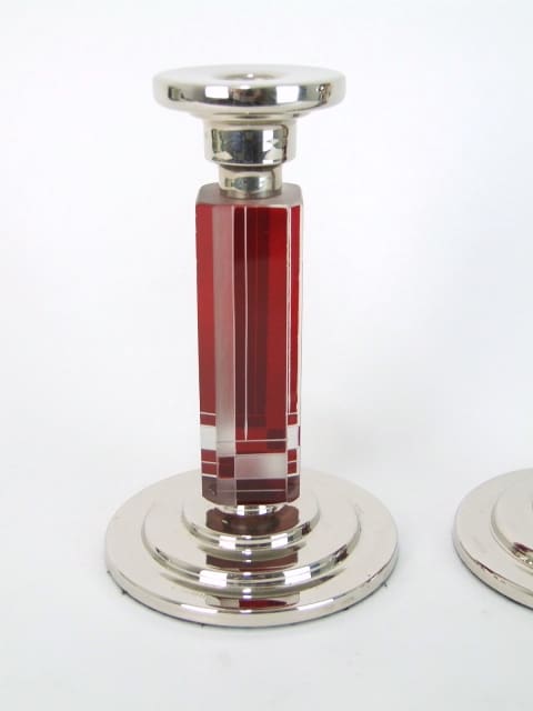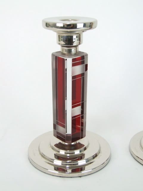 Pair of Czechoslovakian glass art deco candle sticks with hand etched and red enamel patterning. Silver plated tops and base bearing a hallmark.