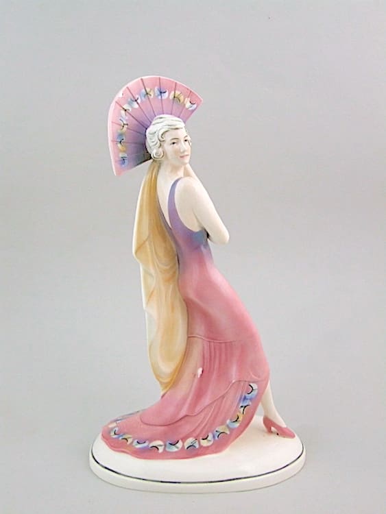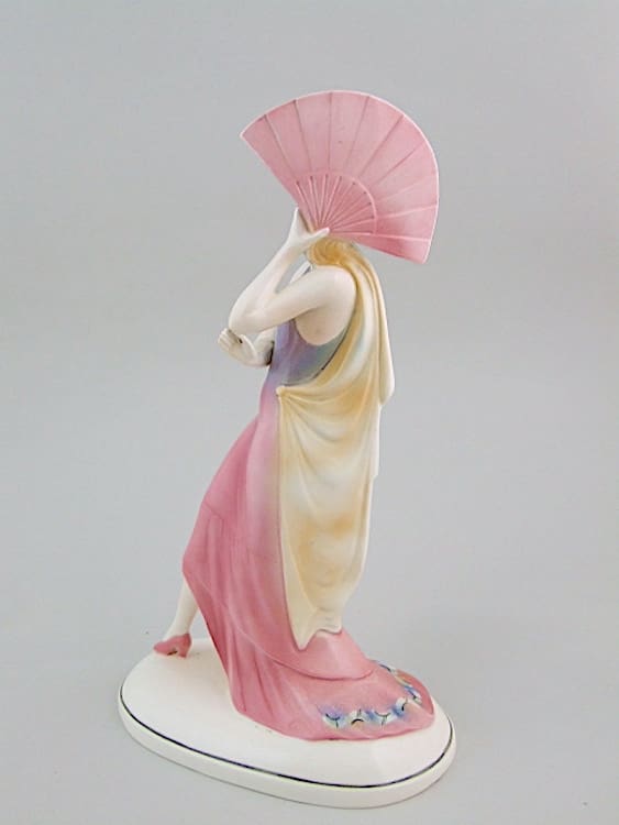 An art deco ceramic lady with fan, signed to the base with the Katzhutte mark.