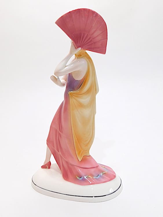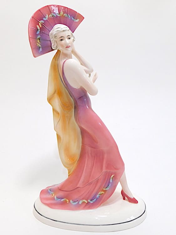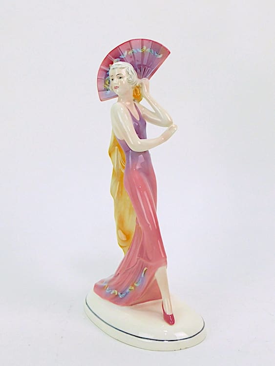 An art deco ceramic lady with fan, signed to the base with the Katzhutte mark.