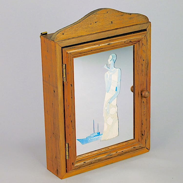 Depicts a smoking flapper lady and a boat on the mirrored glass.
