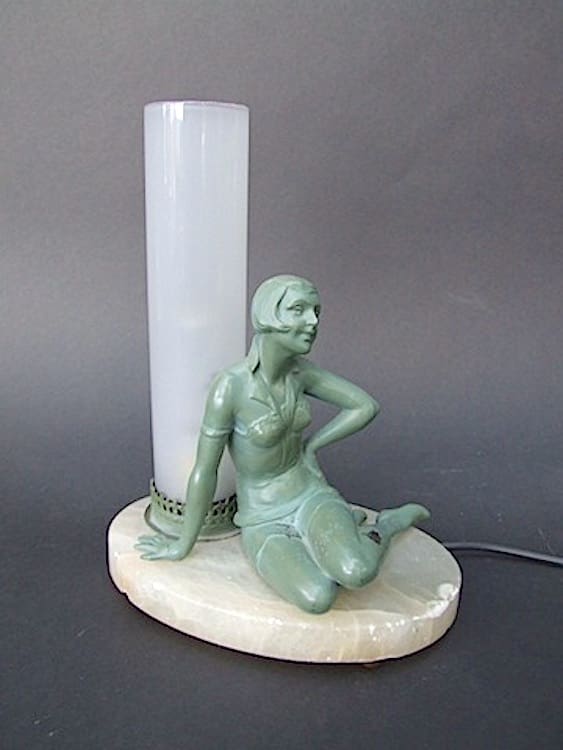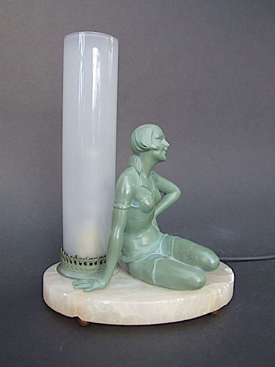 Green patinated spelter lady lamp with a glass tube shade and an alabaster base.