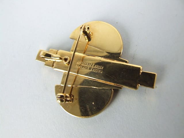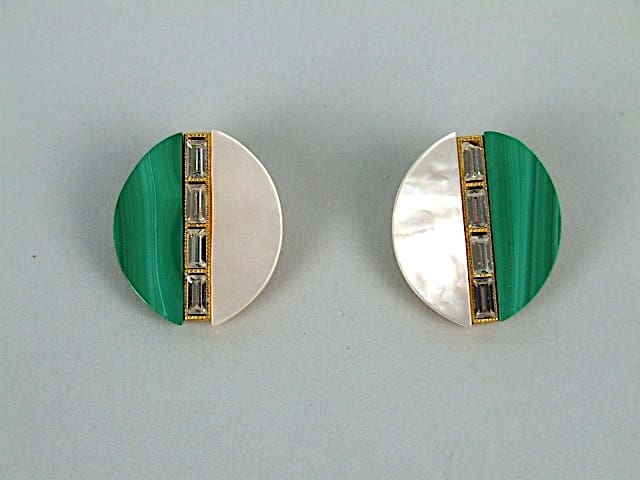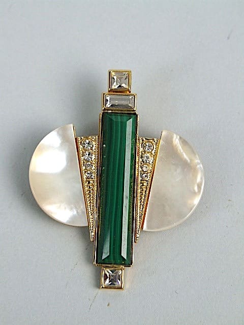 Austrian designer set, consists of a brooch which can also be used as a pendant with matching earrings (clip ons). Beautifully hand made in malachite and pearl and signed to the back Koller.