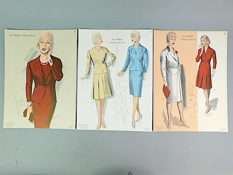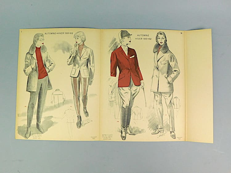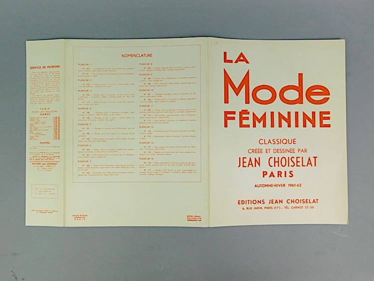Women’s fashion booklet featuring 12 separate cards, 2 aditional designs inside the sleeve and a separate index page. Created and designed by Jean choiselat, Paris. Edition from Autumn-Winter 1961/62.