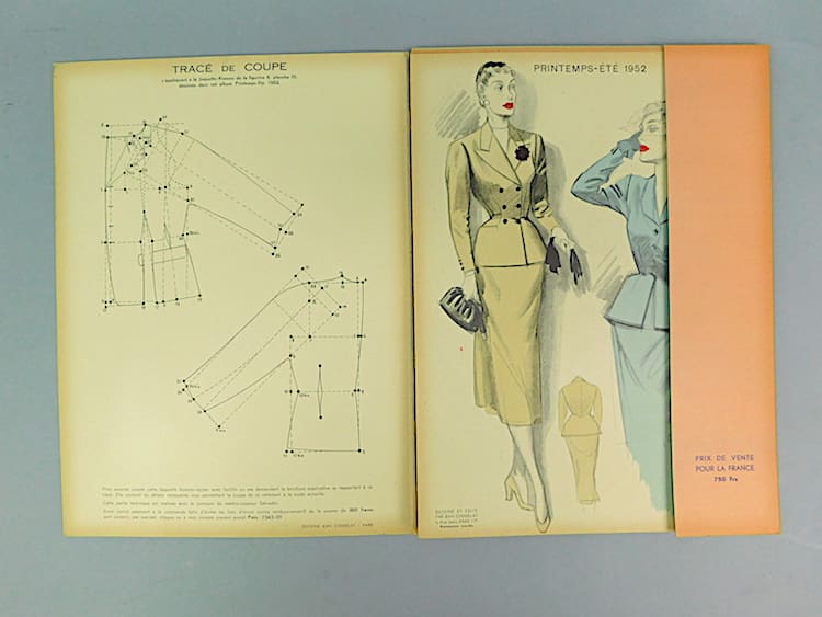 Women’s fashion booklet with an unusual blue cover featuring 12 separate cards, an additional design on the back page of the booklet and a separate detailed index. Created and designed by Jean choiselat, Paris. Edition from Spring-Summer 1952.