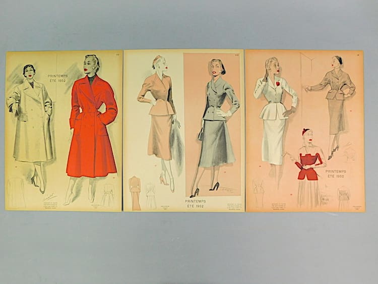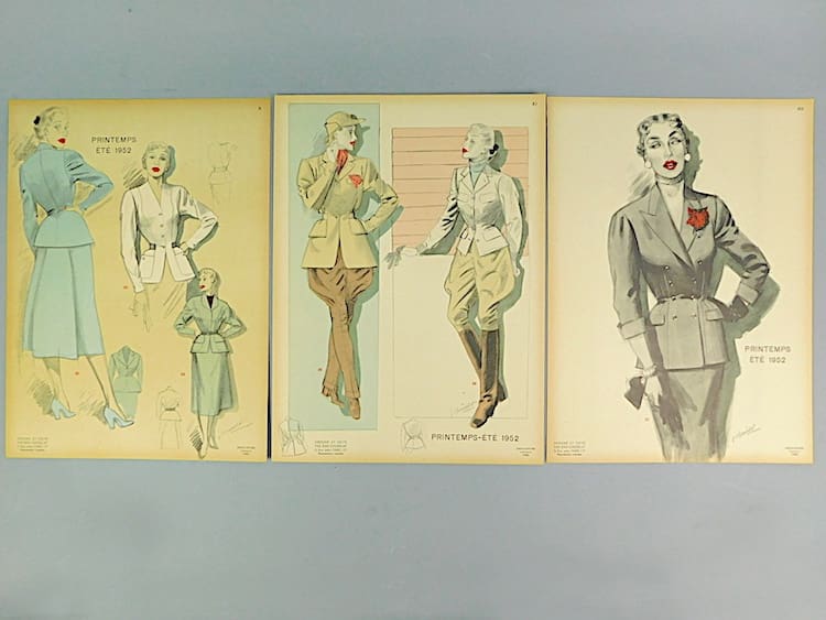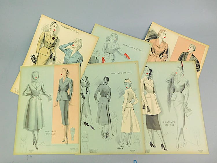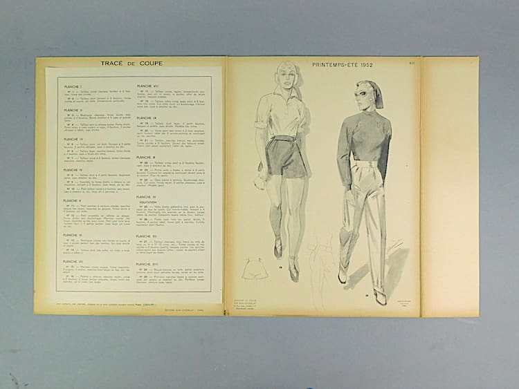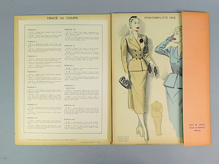 Women’s fashion booklet with an unusual blue cover featuring 12 separate cards, an additional design on the back page of the booklet and a separate detailed index. Created and designed by Jean choiselat, Paris. Edition from Spring-Summer 1952.