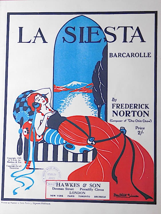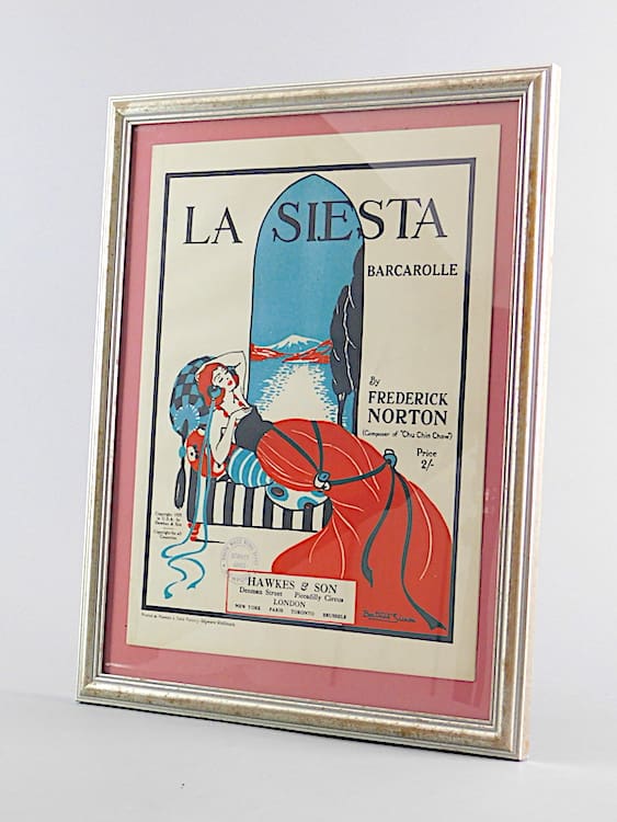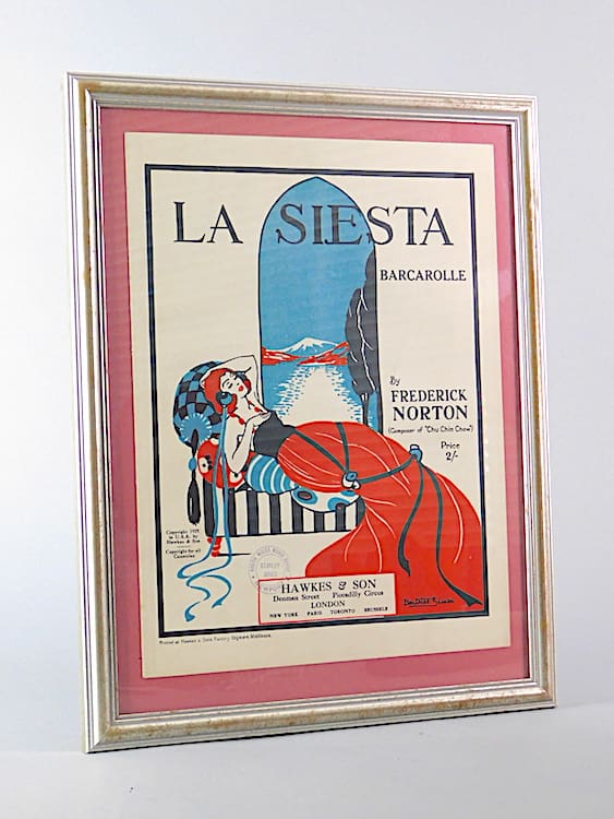 Book of sheet music – La Siesta Barcarolle by Frederick Norton, copyright 1925. Depicts a lounging lady, framed in a contemporary silver wood frame. The entire music brochure is complete in the frame.