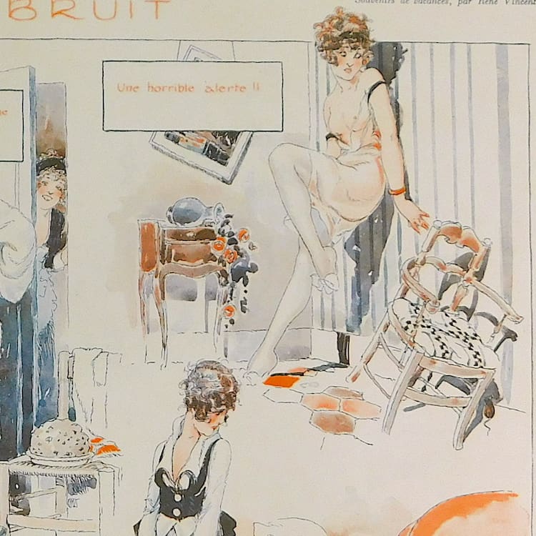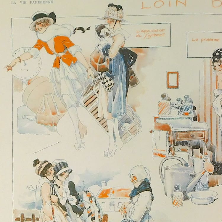 Original double page centre fold from a 1918 La Vie Parisienne magazine. It shows loin du bruit. Would look great framed but being sold unframed.