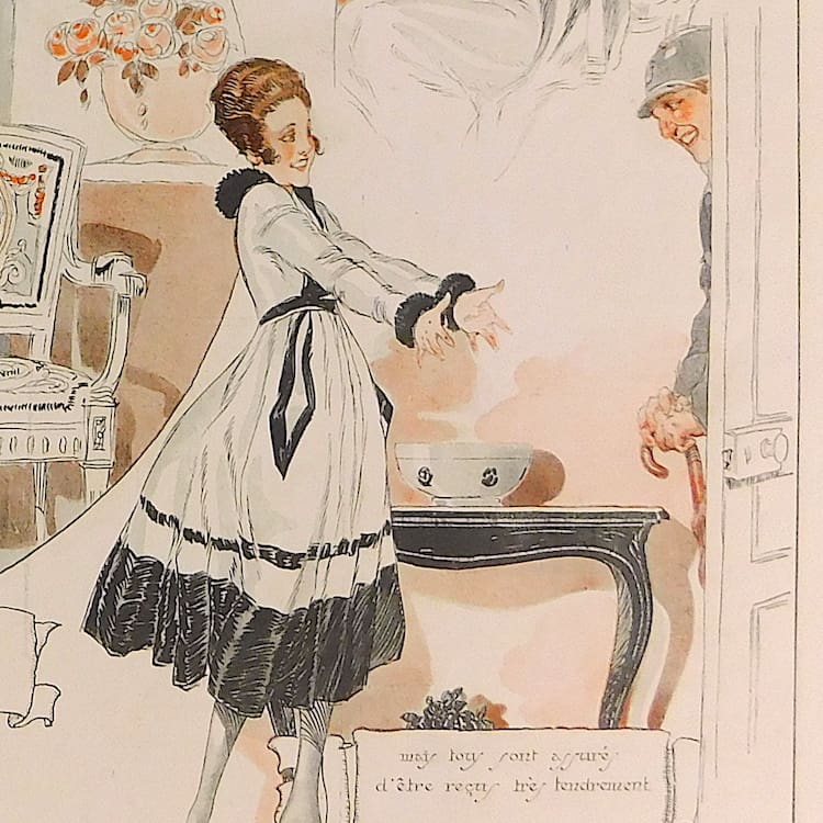 Original 1917 centre fold page titled L’Ecole des Filleuls. Would look great framed but being sold unframed.