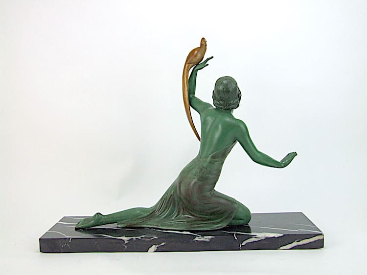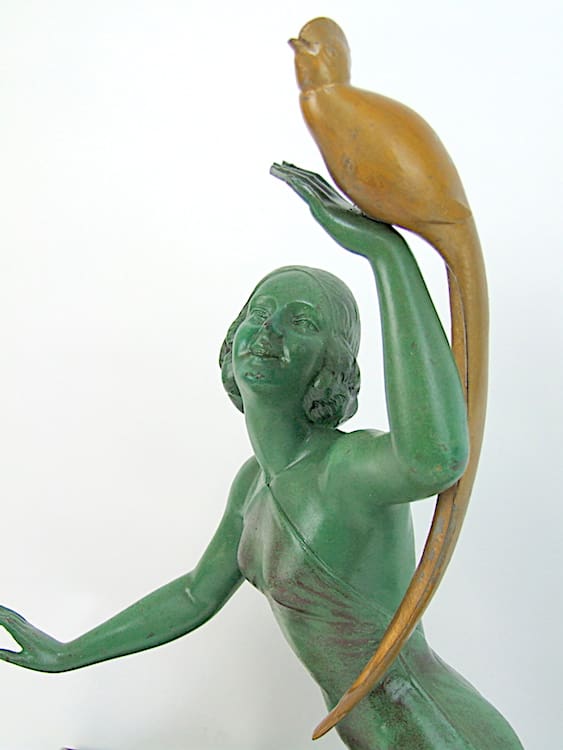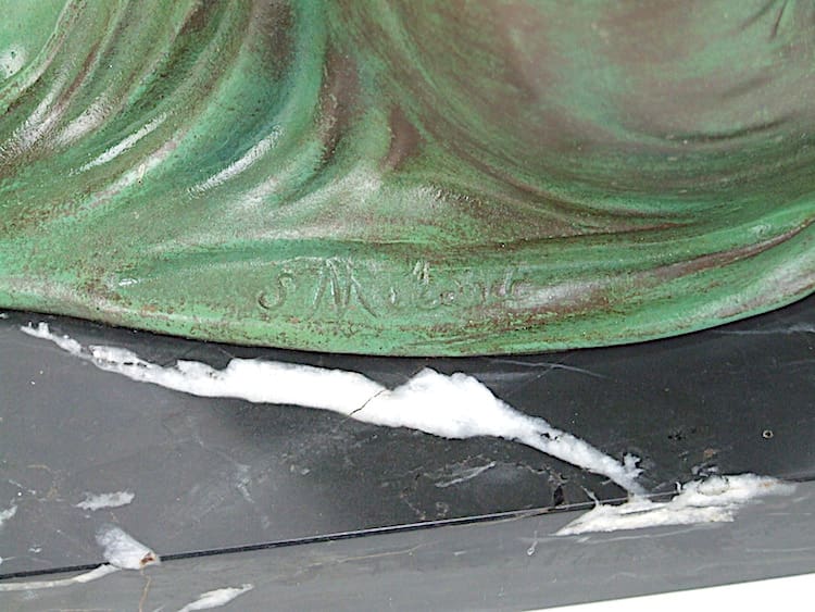 This green patinated French spelter lady is signed S. Melani on a marble base.
