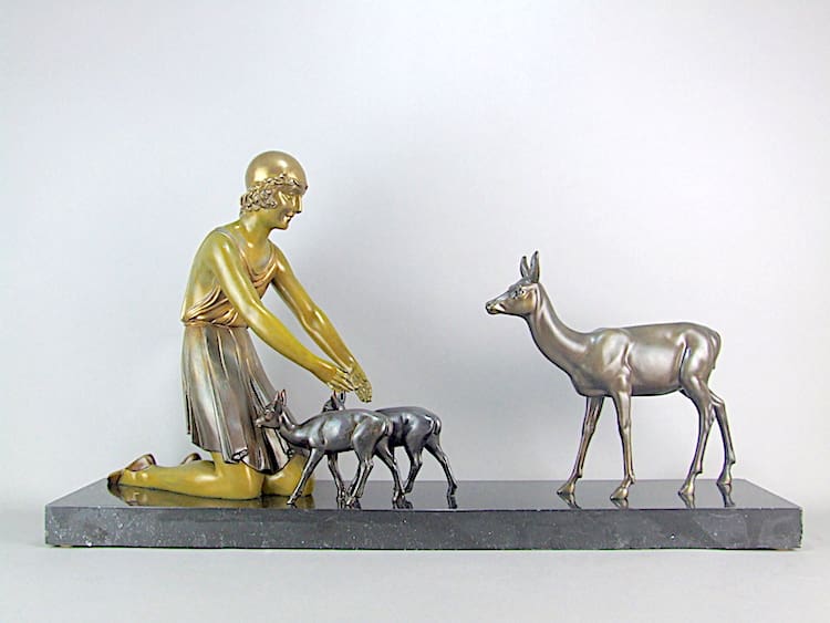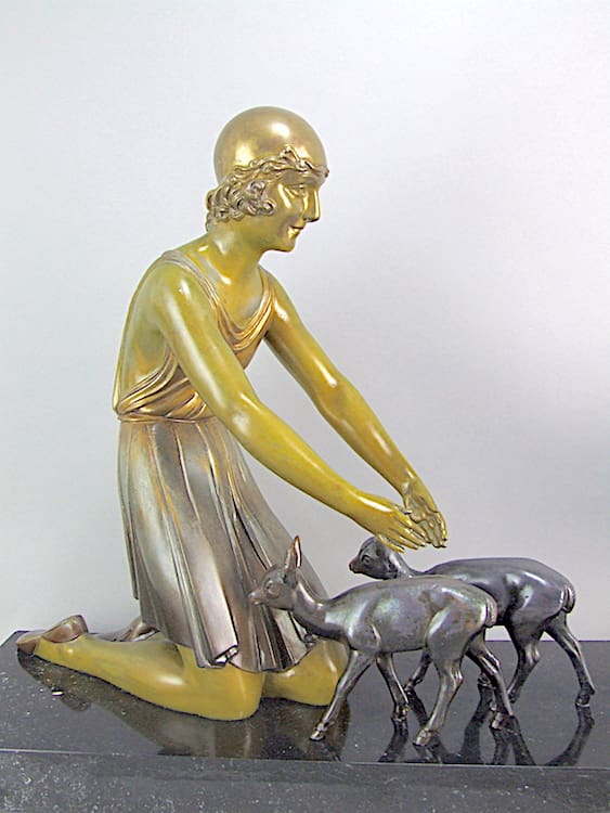 The lady has a green patina with bronze dress colouring and is kneeling on a Belgian Black marble base.
