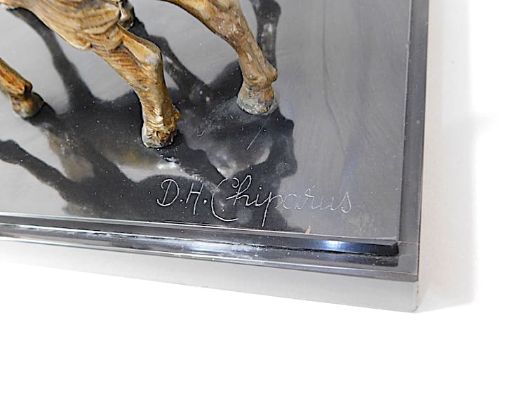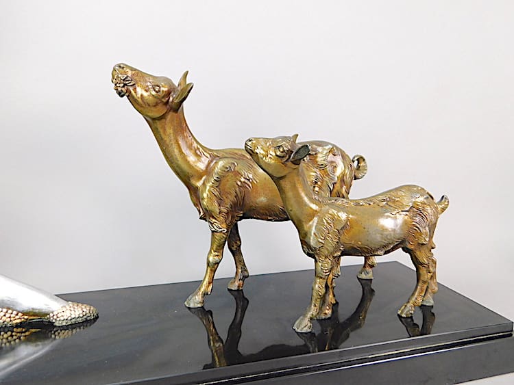 A large French spelter lady and goats group, signed in the black marble base D.H. Chiparus.