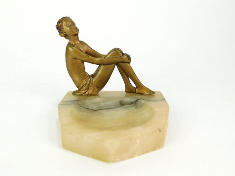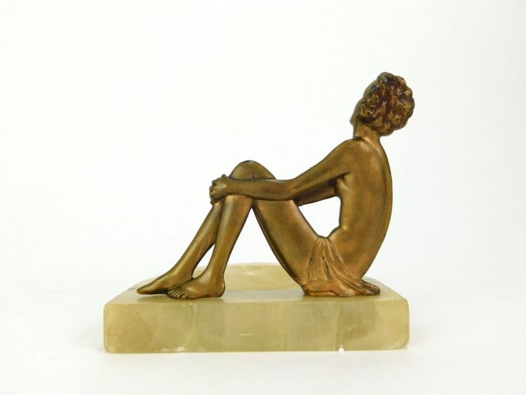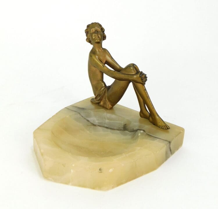 A gilt spelter 2 dimensional lady sitting on the edge of an alabaster dish.