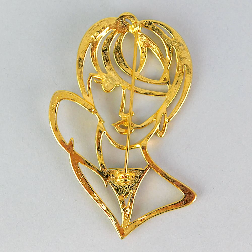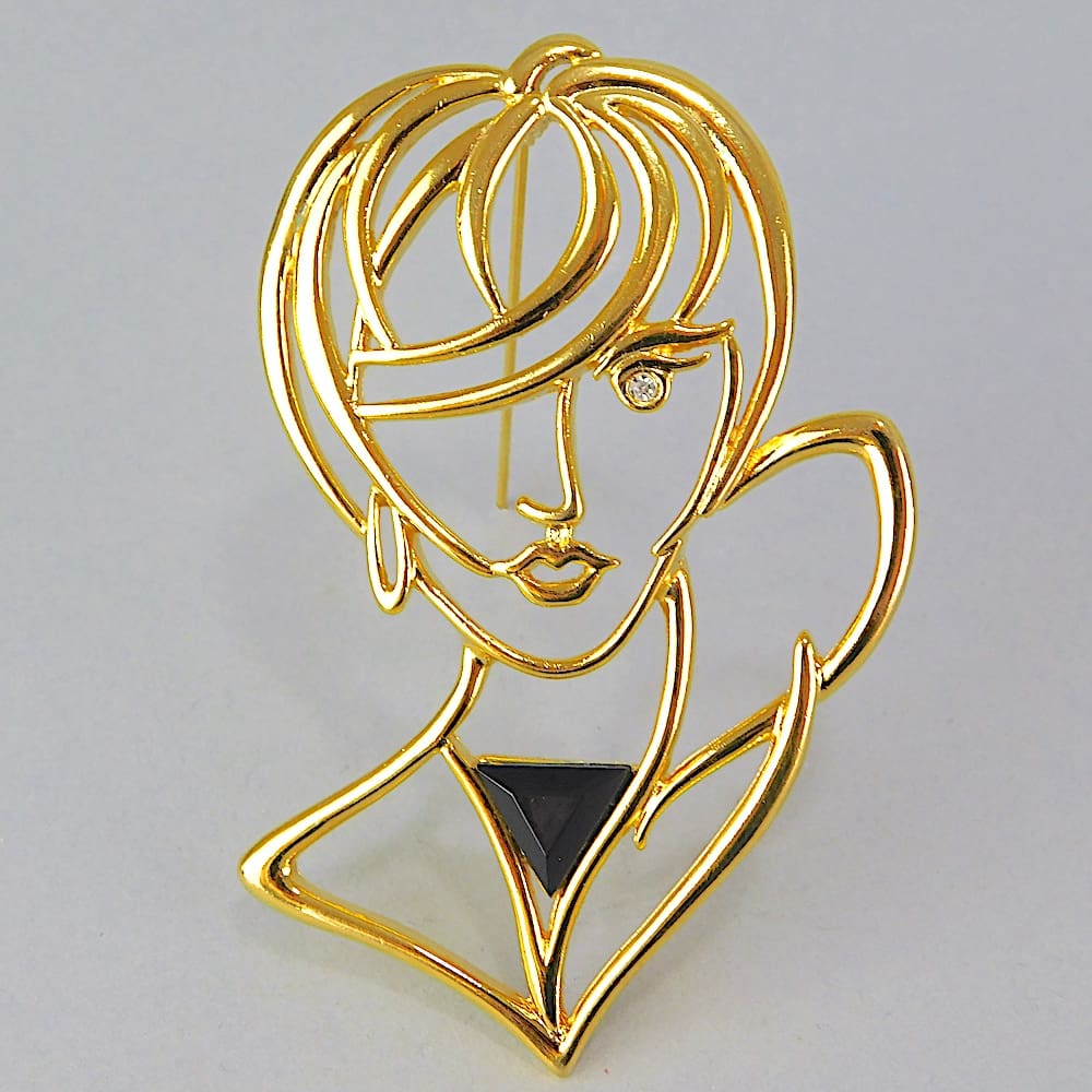 Large stylised lady brooch with diamonte eye and black onyx collar. Signed JJ and dates to around the 1960’s. Fitted with a roll safety clasp.