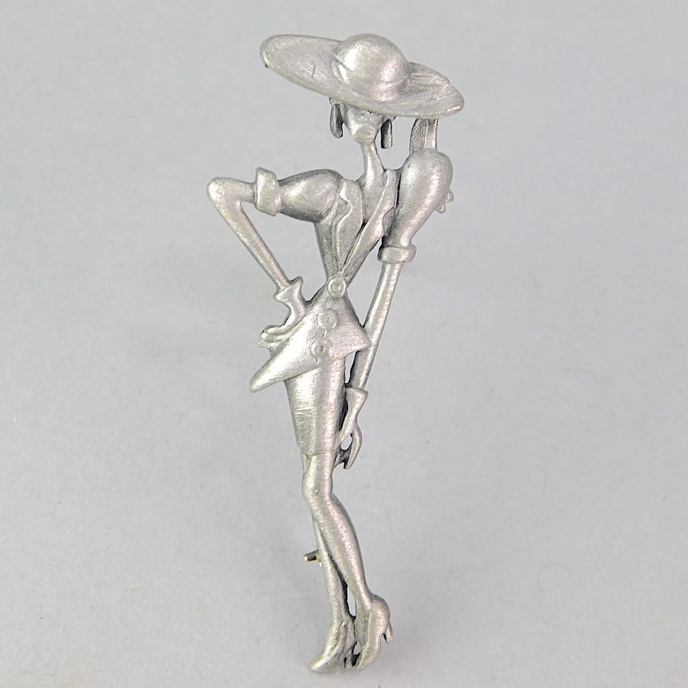 Flapper brooch made of pewter metal. By JJ but not signed. Fitted with a roll safety clasp.