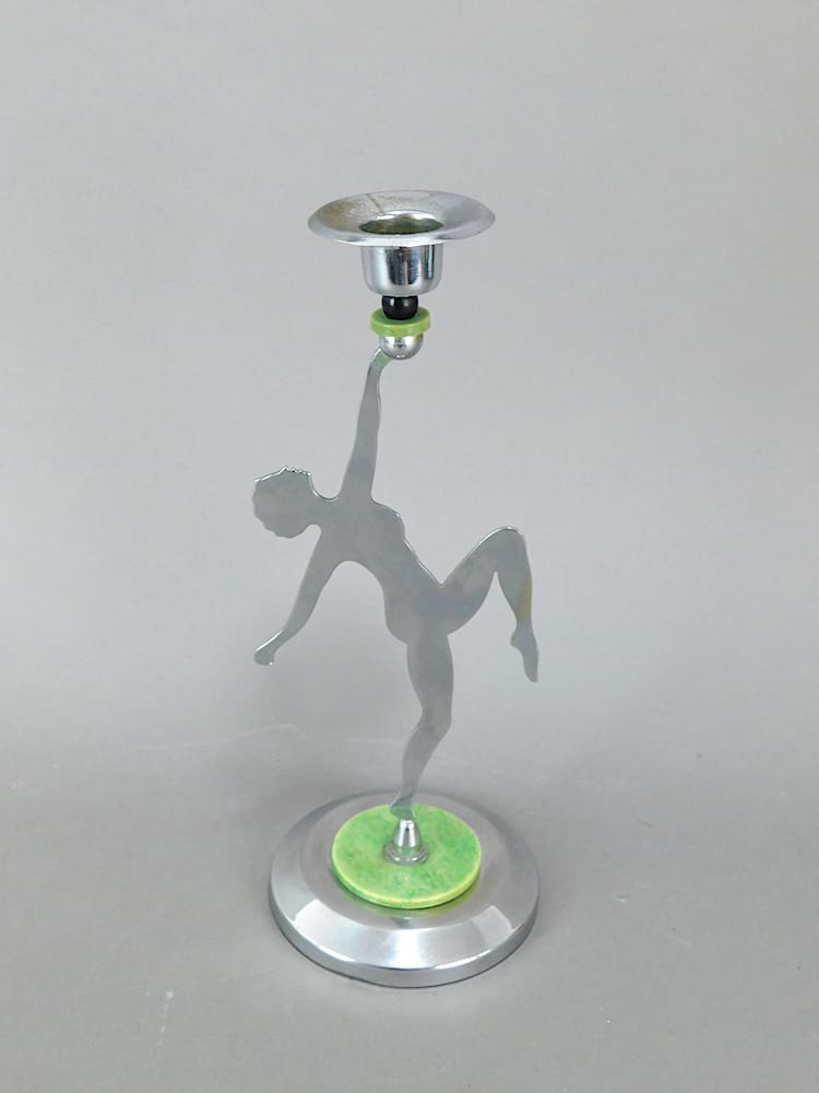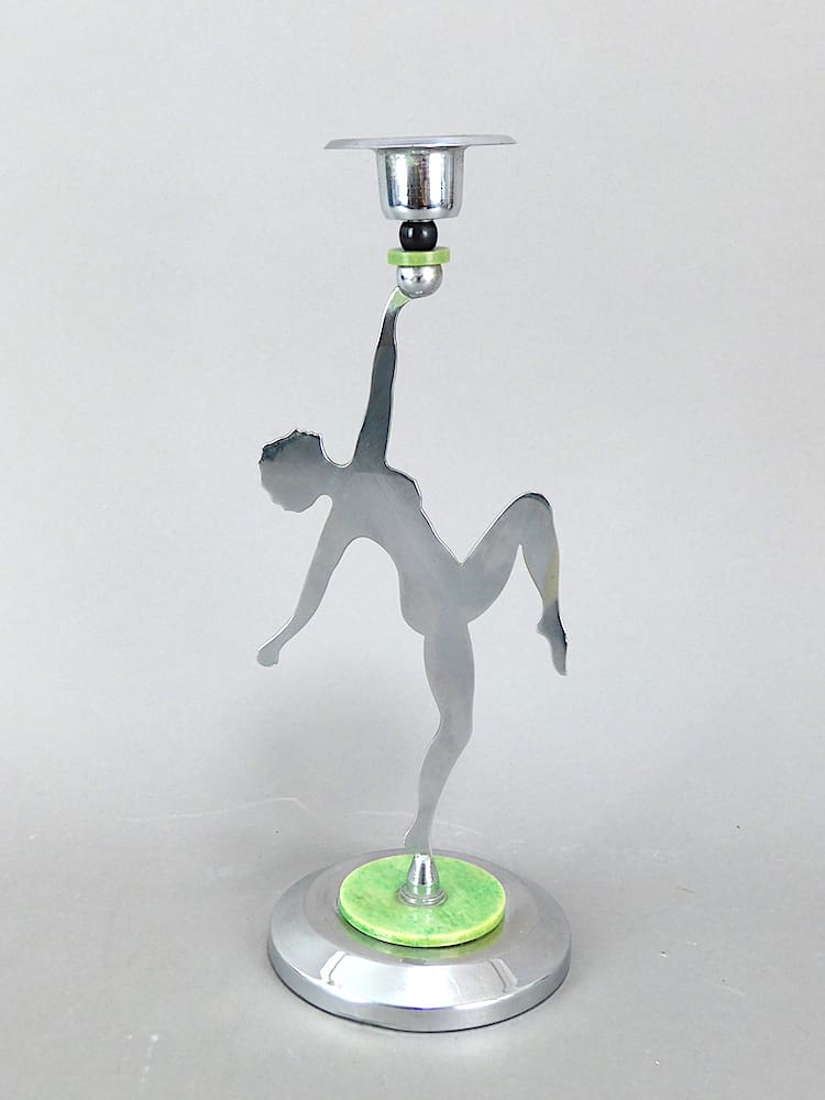 A modernist chrome and green phenolic art deco candle stick depicting a nude dancer.