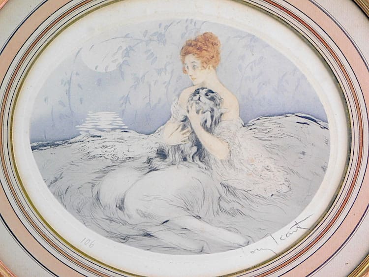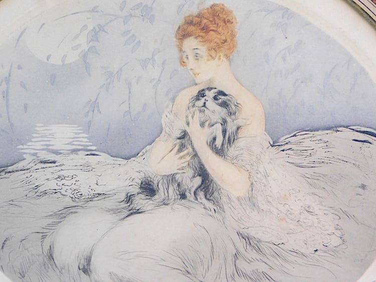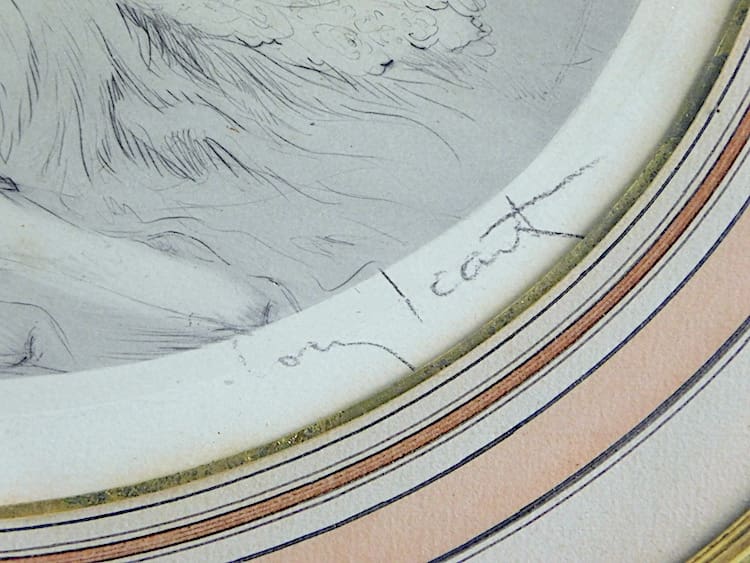 Genuine period dry point etching and aquatint, numbered 106 and signed in pencil. Framed in its original period wood frame with carved rose detailing.