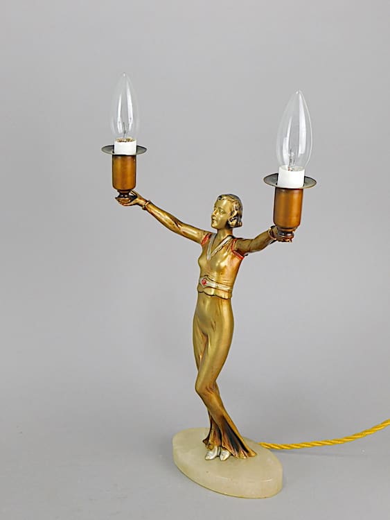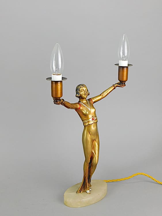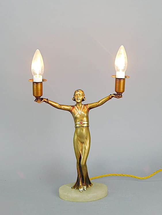 Pretty spelter lady lamp, she wears a very stylish evening gown and is mounted on an onyx base. It is an unsigned piece by Lorenzl with a lovely original golden patina and silvered collar and shoes.